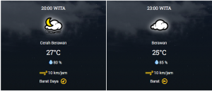 Serta kecepatan angin yang diprediksi dari 10 km/jam hingga 20 km/jam. Cuaca cerah ini akan bertahan sepanjang hari, hingga pukul 23.00 Wita.