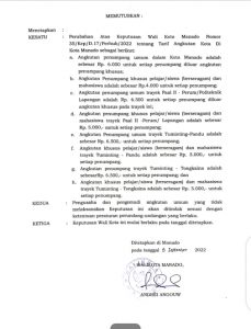 Berdasarkan Surat Keputusan Walikota Manado No. 235/KEP/0-17/PERHUB/2022 Tentang perubahan tarif angkutan umum yang ada di Kota Manado.