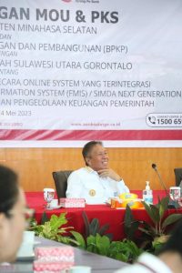 MINSEL, CS – Bupati Minahasa Selatan Bpk. Franky Donny Wongkar, SH, melakukan penandatanganan Memorandum of Understanding ( MoU ) atau Nota kesepahaman dan Perjanjian Kerja Sama antara Pemerintah Kabupaten Minahasa Selatan dan Badan Pengawas Keuangan dan Pembangunan (BPKP) dengan PT. Bank Pembangunan Daerah Sulawesi Utara Gorontalo tentang Pemanfaatan Aplikasi Kas Daerah Secara Online System Yang Terintegrasi Dengan Aplikasi Financial Management Information System (FMIS) /SIMDA Next Generation
