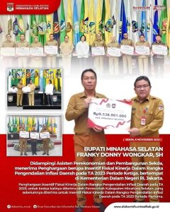 MINSEL, CS – Pemerintah Kabupaten Minahasa Selatan Dibawah Pimpinan Bupati Franky Donny Wongkar, SH kembali menerima Penghargaan berupa Insentif Fiskal Kinerja Dalam Rangka Pengendalian Inflasi Daerah pada TA 2023 Periode Ketiga.Senin ( 06/11/2023)