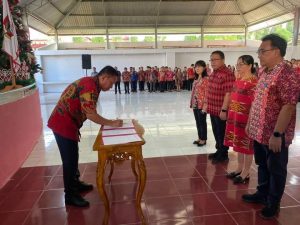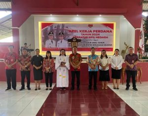MINSEL, CakrawalaSulut // Bupati Minahasa Selatan Franky Donny Wongkar SH Menjadi Pembina Apel dalam Apel Kerja Perdana Tahun 2024 Aparatur Sipil Negara ( ASN ) Dilanjutkan dengan Ibadah Syukur Awal Tahun 2024 Pemerintah Kabupaten Minahasa Selatan, bertempat di Aula Waleta Kantor Bupati Minahasa Selatan.