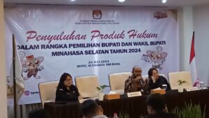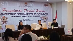 MINSEL, CS – Untuk lebih mengenal tahapan dan aturan terbaru terkait Pemilihan Kepala daerah , Komisi Pemilihan Umum ( KPU ) Minsel menggelar Kegiatan Penyuluhan Produk Hukum dalam Rangka Pemilihan Bupati dan Wakil Bupati Minahasa Selatan Tahun 2024 , bertempat di Hotel Sutan Raja Amurang, Rabu ( 24/07/2024)