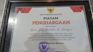 MINSEL, CS – Satu kebanggaan dari Dinas yang dipimpin Arthur Tumipa M.Ed atas kepercayaan Pemerintah Kabupaten Minahasa Selatan (Pemkab-Minsel), dibawah pimpinan Bupati Bpk. Franky Donny Wongkar, SH (FDW), menyerahkan penghargaan dari Ombudsman Republik Indonesia (RI) atas kategori A Zona hijau opini kualitas tertinggi dengan Pencapaian Nilai 89.85.