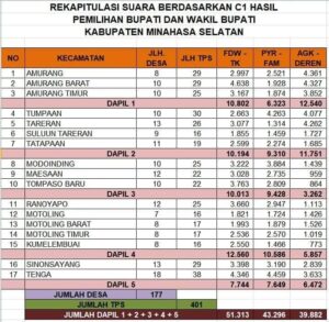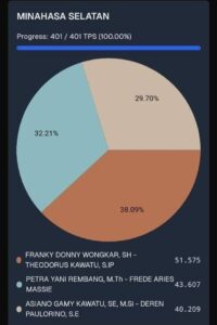 MINSEL, CS – Pasangan Calon Bupati dan Wakil Bupati Minahasa Selatan Nomor Urut 1 Franky Donny Wongkar dan Theo Kawatu (FDW-TK) klaim kemenangannya dalam Pemilihan Kepala Daerah ( Pilkada ) Kabupaten MInahasa Selatan Tahun 2024. Paslon tersebut mengklaim meraih suara terbanyak berdasarkan rekap data C1 dengan perolehan 38,19% Suara atau dengan jumlah 51.602 suara.
