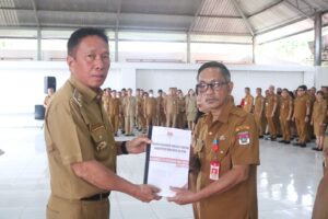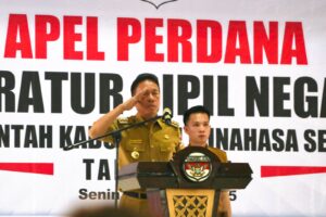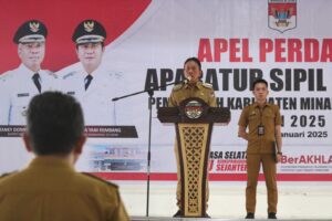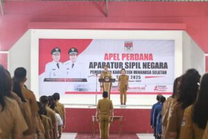 MINSEL, CS – Bupati Minahasa Selatan Franky Donny Wongkar, SH.,memberikan arahan pada Apel Perdana ASN Pemerintah Kabupaten Minahasa Selatan Tahun 2025, bertempat di Aula Waleta Kantor Bupati Minahasa Selatan, Senin ( 06/01/2025)