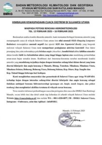 Berdasarkan Surat Himbauan dari Badan Meteorologi dan Geofisika (BMKG) Provinsi Sulawesi Utara Tanggal 11 Februari 2025. Perihal Himbauan Waspada Potensi Bencana Hidrometeorologi tanggal 12 s/d 16 Februari 2025 di Sulawesi Utara.